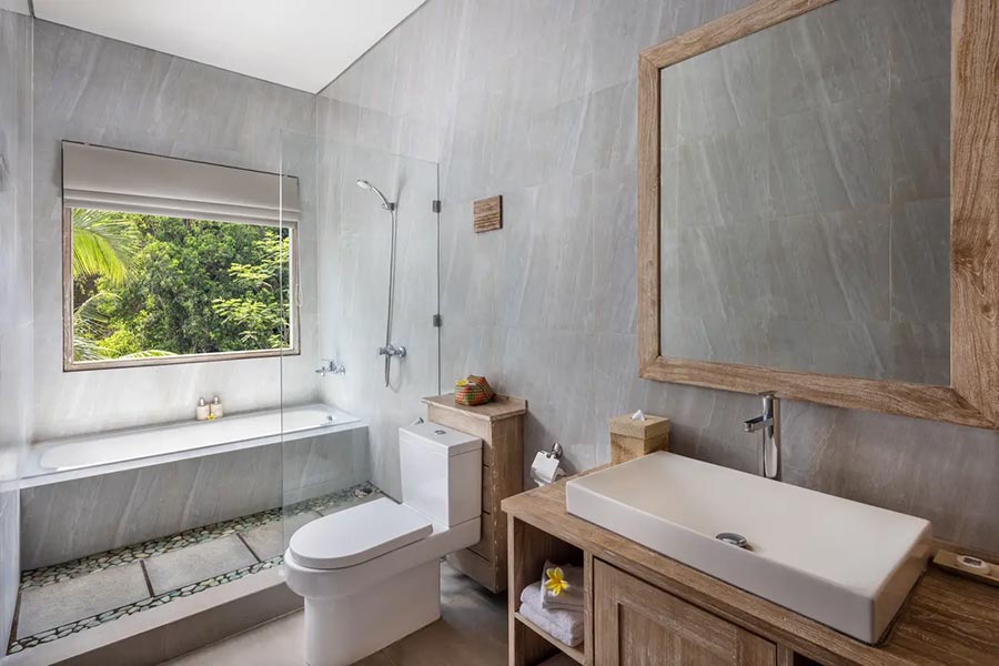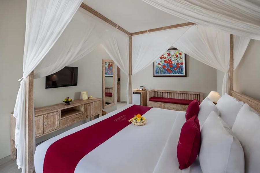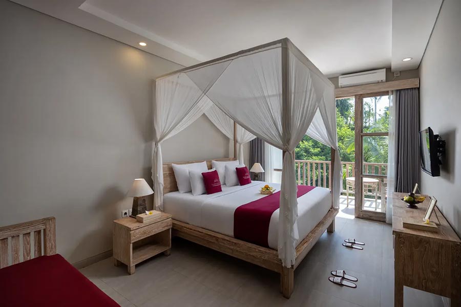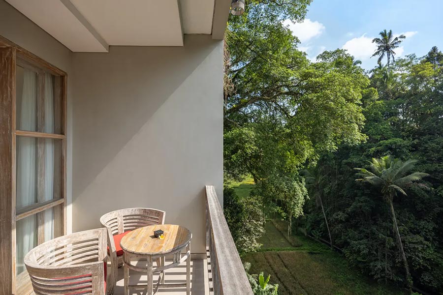 Wake to the sight of mist drifting across emerald rice terraces, with sunlight pouring through your private balcony. Inside, soft bedding, linens and warm textures create a cocoon of comfort, where every moment is wrapped in quiet rainforest stillness. Evenings here flow gently, inviting you to rest deeply and dream freely in the heart of Ubud’s valley.